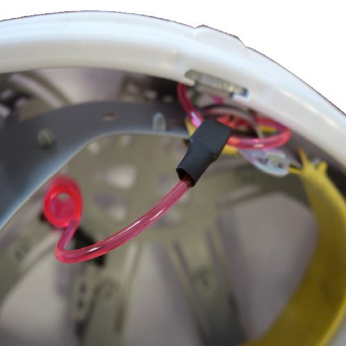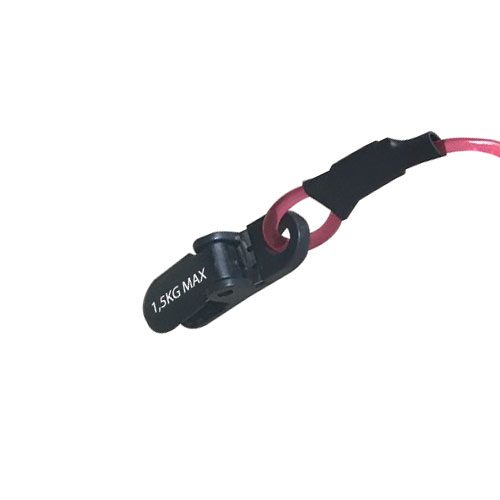 Elle est équipée, à une extrémité, d’une pince bretelle (fixation sur vêtements etc.) et, de l’autre, d’une boucle (fixation sur le casque).