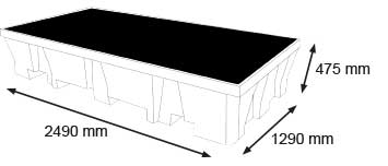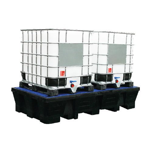 Bac de rétention PE noir avec caillebotis pour deux cuves. Résistant à la plupart des produits chimiques et aux U.V. Multiples entrées de fourches pour une utilisation avec gerbeur et autres engins de manutention
