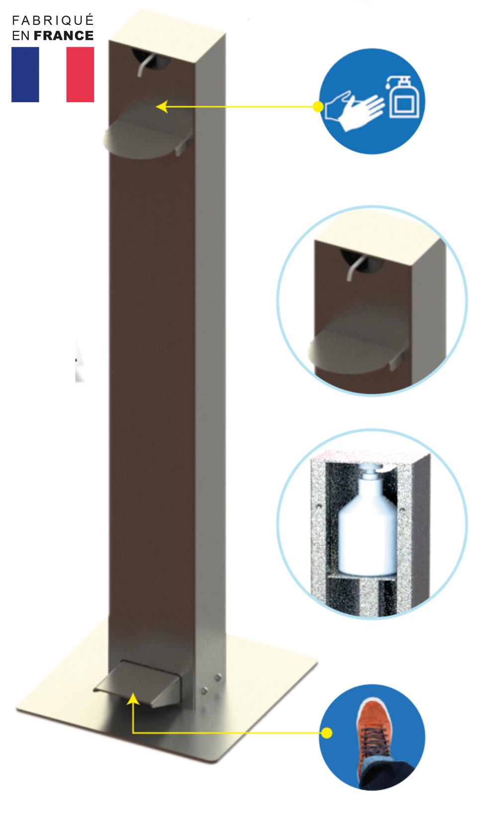Cette borne en acier est à usage totalement mécanique et sa mise en oeuvre est immédiate. Sa commande à pied évite tout contact des mains avec la borne et le distributeur de gel.