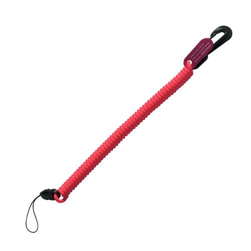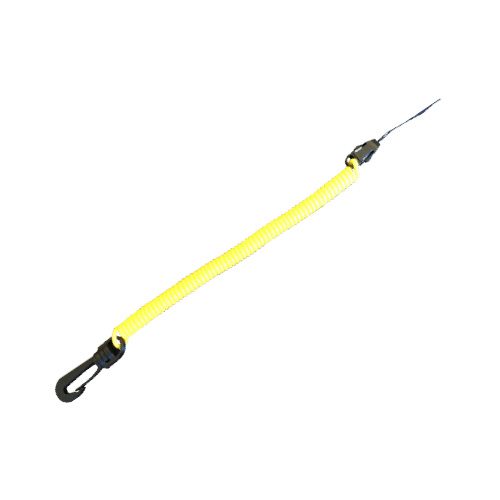 Longe de sécurité avec d’un côté un mousqueton pivotant en plastique noir et de l’autre une boucle fixe à cordon.