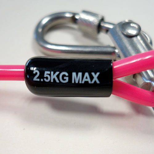 Le cordon à spirale FMEATTAC2CROCHE50MT (fuchsia) et FMEATTACHEOUTILJ (jaune) est notre version la plus légère. Il est équipé de deux mousquetons fixes pour une fixation solide. Ce cordon est idéal pour les charges allant jusqu’à 2 kg.