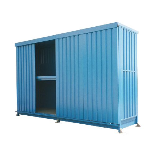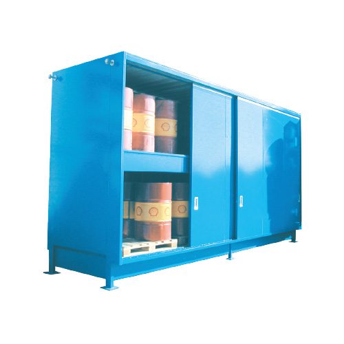 Le container de stockage standard est équipé de portes coulissantes et de bacs de rétention à chaque niveau.