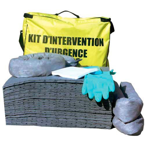 Kit antipollution d’urgence pour hydrocarbures, tous liquides et produits chimiques, d’une capacité d’absorption de 10 à 90 litres.