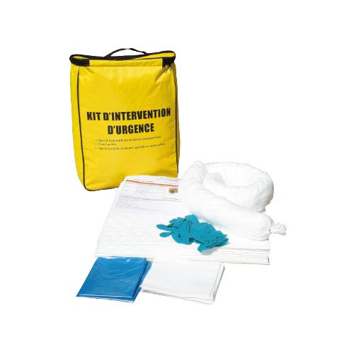 Kit d’intervention d’urgence pour hydrocarbures, tous liquides et produits chimiques, d’une capacité d’absorption de 10 à 90 litres.