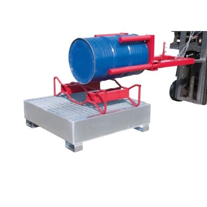 Manipulateur de fûts permettant de saisir un fût métallique en position verticale et le ramener en position horizontale ou inversement.